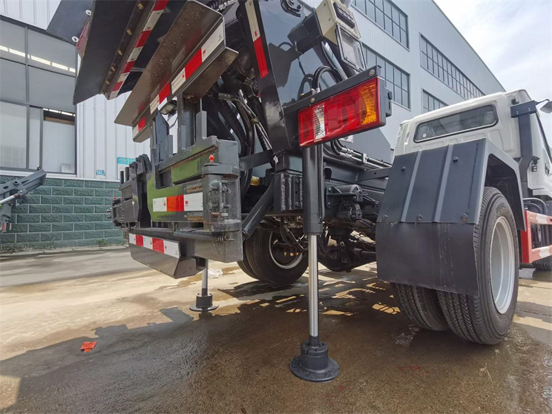 2、與大中型垃圾壓縮車對接,伸出支腿,傾翻垃圾箱,打開刮板,傾倒垃圾。