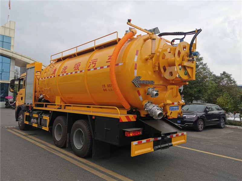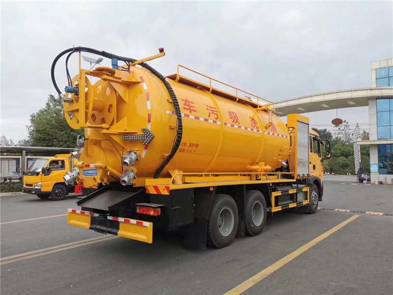 這款車型通車工程黃,標準配置了通徑25高壓管60米,后封頭下部開600mm內通徑液壓排污口1個,后蓋左下6寸排污閥1個,后蓋右下4寸排氣閥1個,4寸吸污閥1個,防溢流裝置,后尾部裝雙箭頭燈,清水罐頂部裝1個排氣閥,清水罐底部裝1個排水閥,罐體兩側平臺用優質碳鋼材質,底盤空間充分利用,排氣管和水循環管不占用平臺空間,循環水管上裝1個洗手龍頭等等。