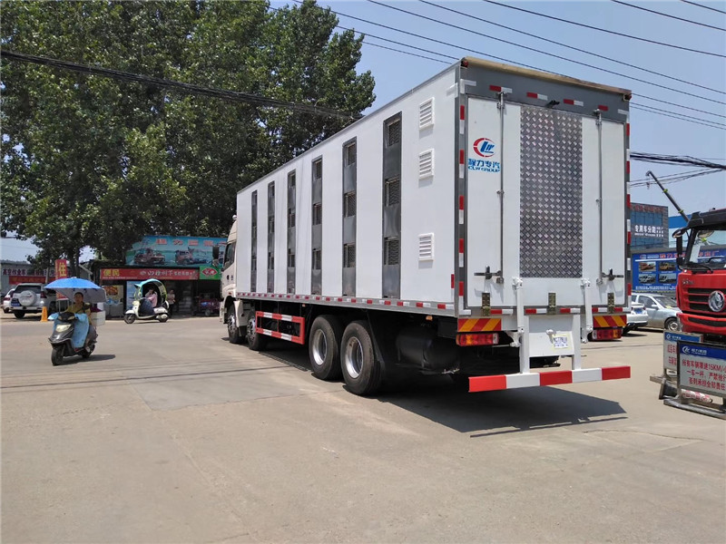 東風多利卡D9豬仔運輸車整車尺寸:9080×2500×3850,廂體尺寸:5980×2340×2470,乘坐3人,軸距5200,馬力180P,排量5.9L,載重7805kg。此車廂體外玻璃鋼材質,內不銹鋼材,帶尾部反轉上車平臺。廂體內裝有加熱器和制冷機組,恒溫可達到25°。廂體上下分兩層8個單元,兩面廂板上分別裝有12個通風口,尾部4個排氣扇,讓空氣更流暢。廂內裝有喂水系統,監控系統等。