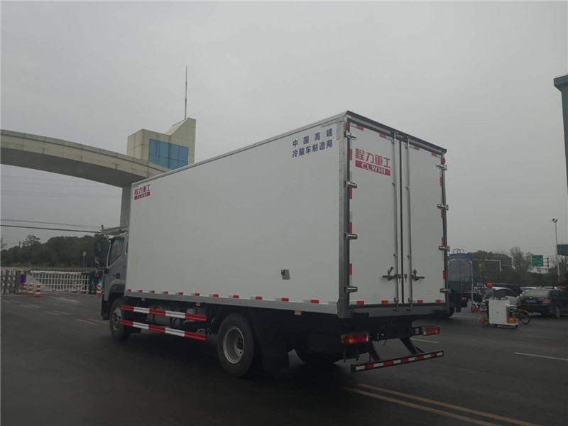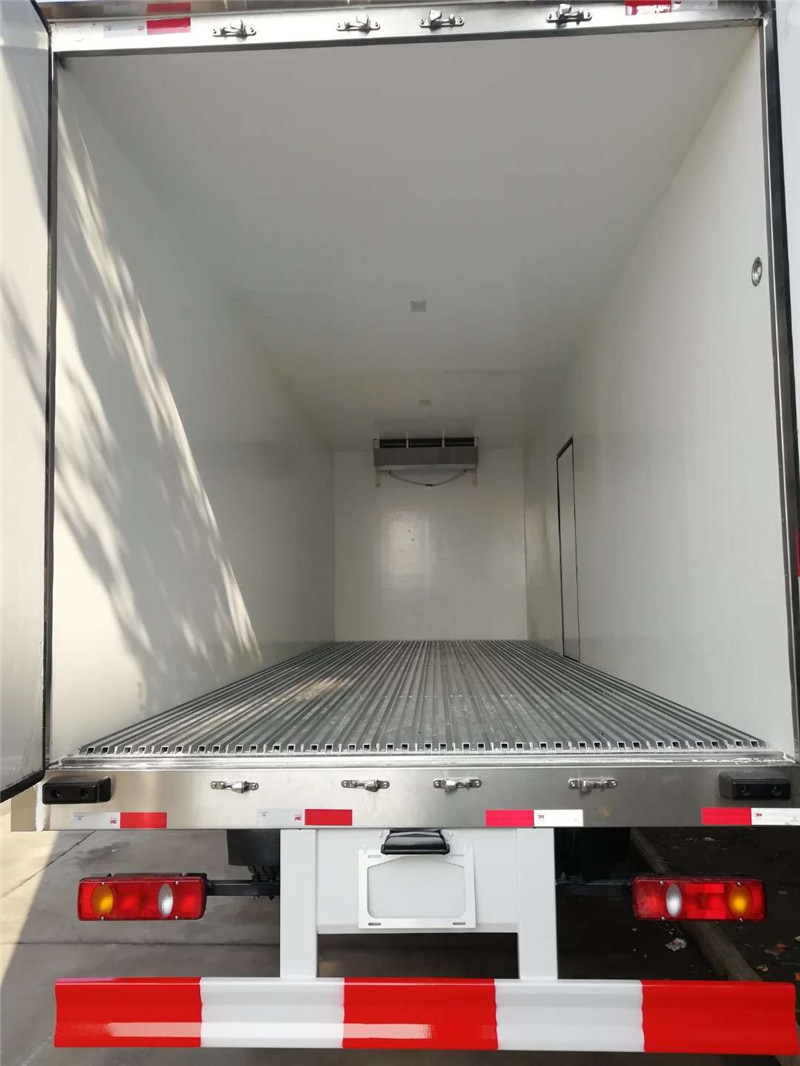 這款冷藏車選裝單排駕駛室,對應貨箱欄板內尺寸長4100mm或者4000mm,3600mm;選裝排半駕駛室,對應貨箱欄板內尺寸長3800mm或者3700mm,3250mm。選裝同等功率的制冷機組,選裝前面罩,選裝導流罩,選裝保險桿,選裝燈具,選裝后視鏡,選裝后視鏡支架,選裝貨廂外觀結構,選裝側防護。車廂頂部封閉,不可開啟。整車寬度與貨箱寬度參數一一對應,外形尺寸高與貨廂欄板內尺寸高一一對應,軸距和后懸參數一一對應。側面防護裝置所用材料材質為Q235A,連接方式為螺栓連接;后部防護裝置所用材料材質為Q235A,連接方式為螺栓連接。
