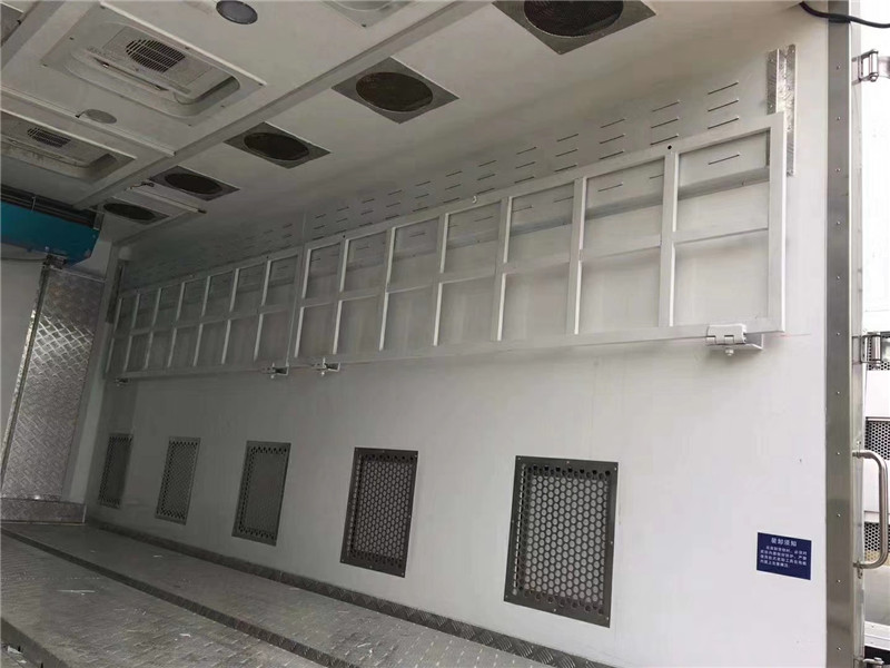 東風(fēng)天龍恒溫運(yùn)豬車整車上裝采用沖孔板和保溫板雙層板結(jié)構(gòu)