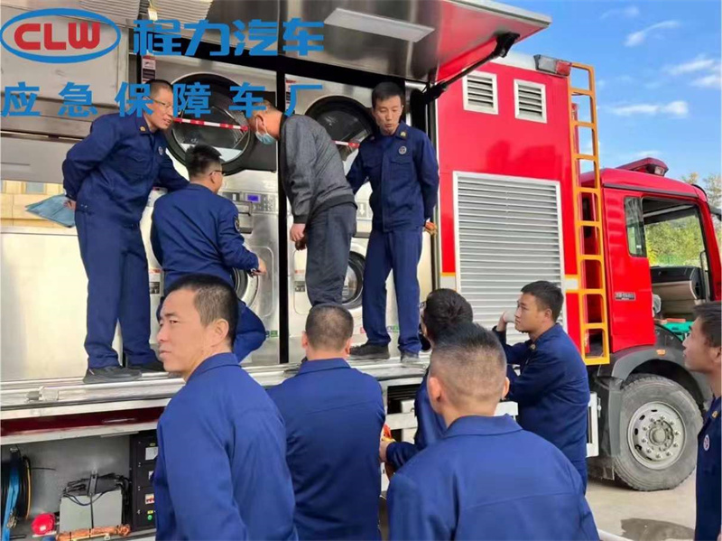 被服洗滌消防車該車由廂體、洗滌系統、給排水系統、車載自發電系統、電氣控制系統等構成。廂體裝備了上下對開式側門,上翻形成遮陽擋雨罩,下翻形成作業平臺;裝備了大型工業水洗機和干衣機,洗脫、烘干能力大;