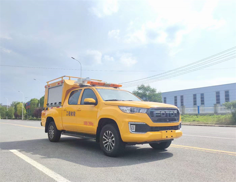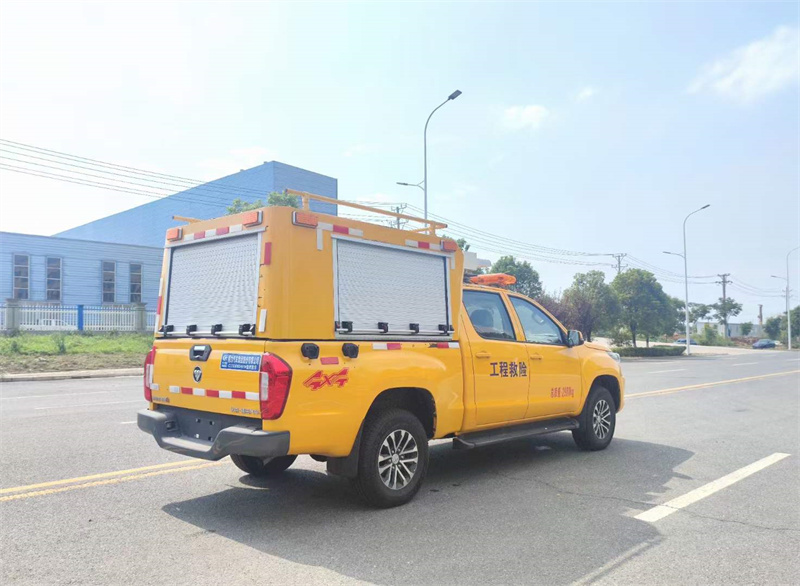 該車頂部安裝了工程警燈,車身采用醒目的工程黃,并貼有”工程救險車”的大字。多方位圖:底盤配置:鹵素大燈、245/70R16輪胎、鋁合金輪輞、仿皮座椅、ABS+EBD、前盤后鼓、前排普通三點式安全帶、后排中間兩點式兩邊三點式安全帶、LED日間福田四驅皮卡工程應急搶險救險車 皮卡式應急搶險救援車具有高承載性,功能實用性和耐用性,具備快速的應急響應能力。
