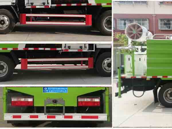 隨底盤選裝駕駛室.側防護及后下部防護裝置均采用Q235A材質,均采用焊接連接,后下部防護尺寸:50×120(mm),離地面高度390mm;ABS廠家及型號:襄陽東風隆誠機械有限責任公司/ABS /ASR -12V-4S/4M.專用裝置為抑塵霧炮,用于礦場,露天堆場及爆破現場等的噴霧抑塵.整車長/軸距/后懸對應關系為(mm):6400/3308/2037,5905/2950/1900,5455/2700/1700.