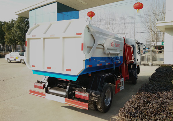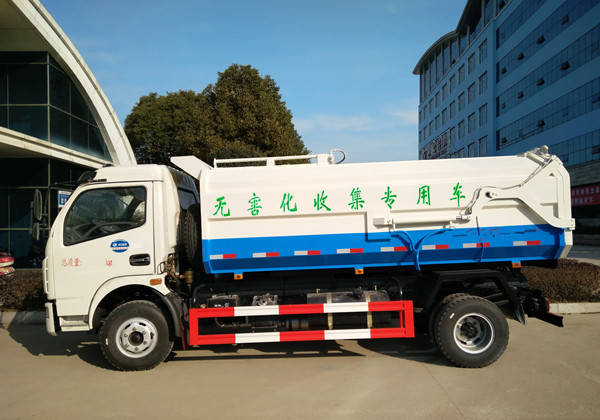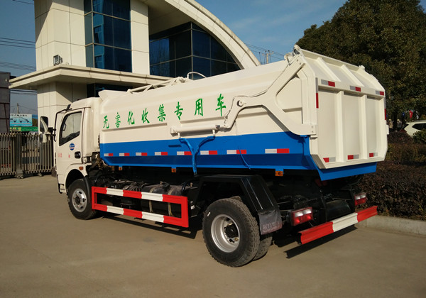 上裝配置:側面掛桶,容積約8立方,采用特種鋼板制作,箱體底板4mm,邊板3mm,箱體內部帶液壓推板,將垃圾壓實,側面帶掛桶擔升機,提升速度快,尾部帶3mm橡膠密封條,污水不滴漏,箱體油漆及噴字按用戶要求定制。