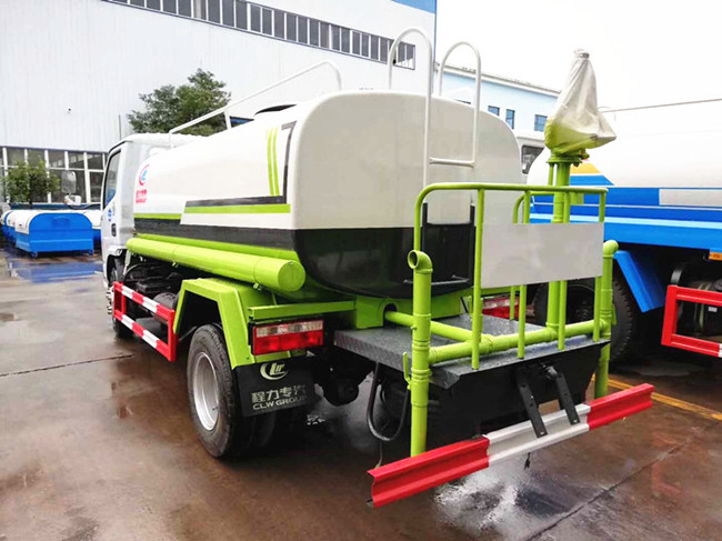 專用配置:罐體容積 5立方,罐體采用國標Q235碳鋼材質,罐體厚度4MM,前后封頭5MM加厚型,罐體內雙層隔板具有防波蕩作用,以減輕汽車行駛時罐內液體沖擊;灑水車整車及外形尺寸嚴格按照國家機動車公告制作而成;裝配大功率專用灑水泵,前沖、后灑、側噴、后平臺帶綠化灑水炮,灑水炮可全方位旋轉,可連續調成直沖狀、大雨、小雨、毛毛雨;配消防接口,自流閥,濾網,帶自吸自排功能。前封頭帶水位計,后平臺主管路帶1寸澆花接口,后爬梯,帶1個消防接頭,帶1個自流閥,1個過濾裝置,其余標配。1、可選裝后平臺帶霧炮機組用于噴霧降塵、農藥噴灑作業;2、可選裝前置電子灑水炮駕駛室操作;3、可選裝氣動球閥駕駛室操作。