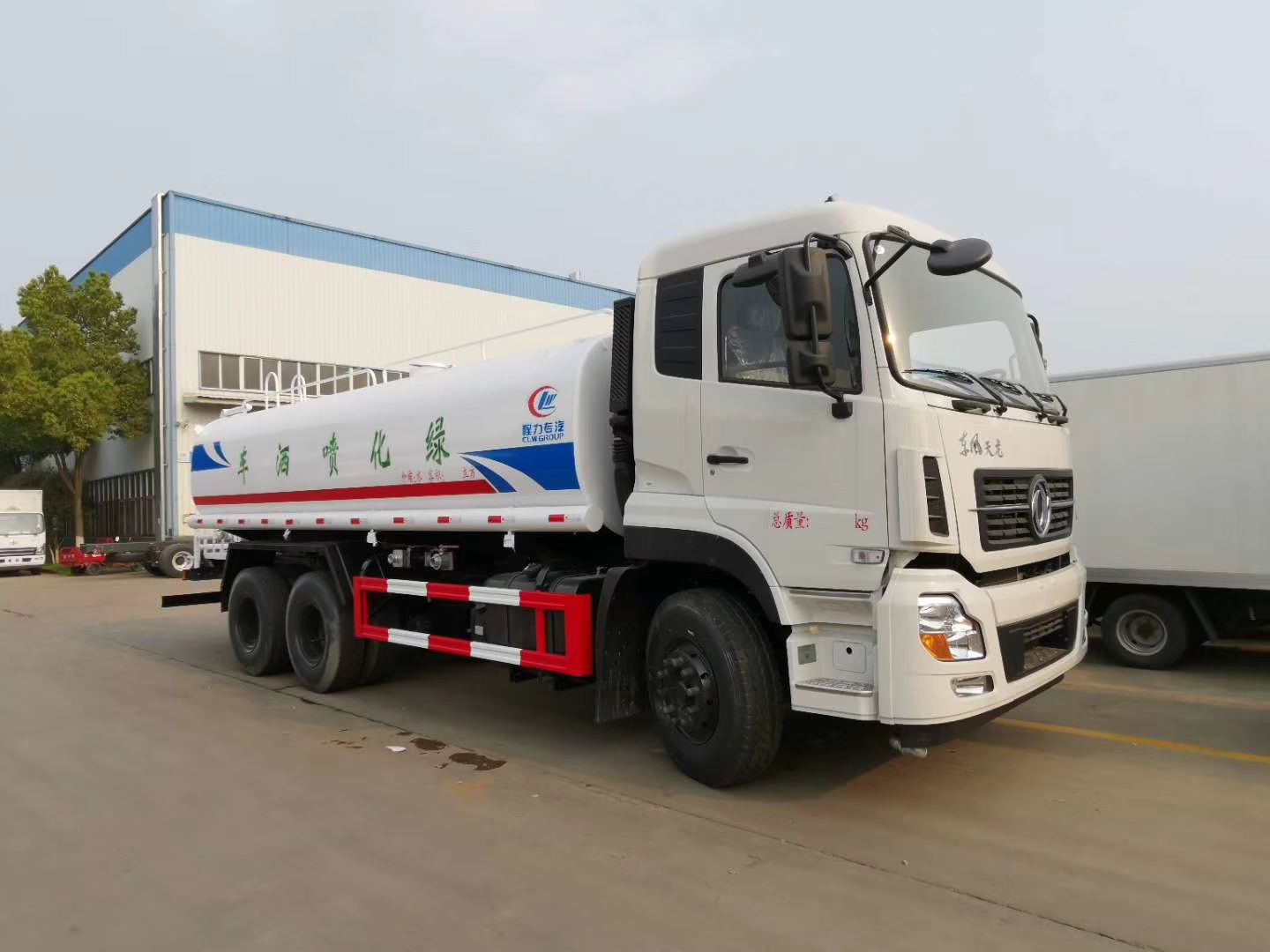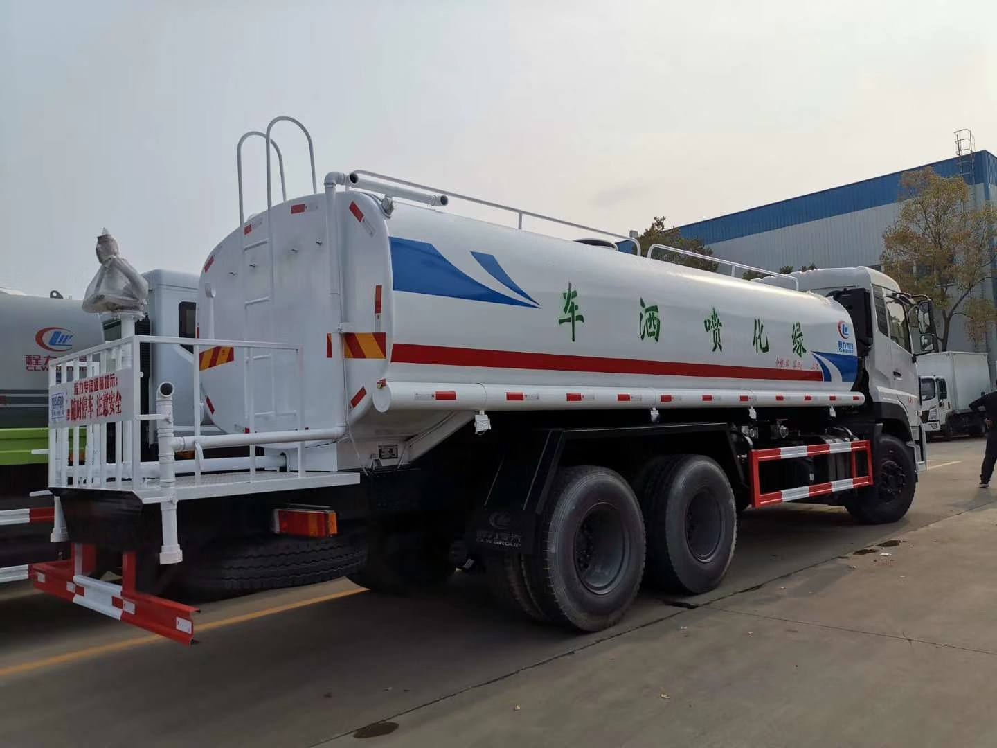 罐體實際容積20m3,采用Q235碳鋼板制作,5mm厚,封頭6mm厚,內部隔浪板,防止罐體內液體在緊急剎車或快速起步等運動中對封頭產生沖擊,引發危險配罐口蓋,帶后爬梯;管道及球閥;帶泵,80QZ-60/90自吸式水泵,流量為60m3/h,揚程為90米,垂直吸程為10米,配備消防接口,可在消防接口取水,放水方式有兩種,自流口自排和泵加壓排水,帶兩根橡膠軟水管,快速接口。整車顏色為上白下藍本色,駕駛室顏色有紅色和白色可選,罐體顏色可按客戶要求噴色或貼印圖案Logo。