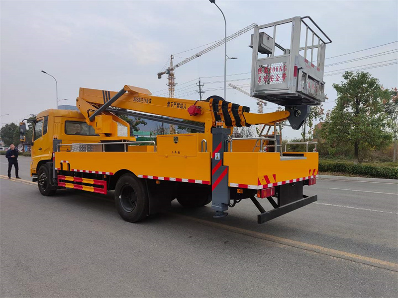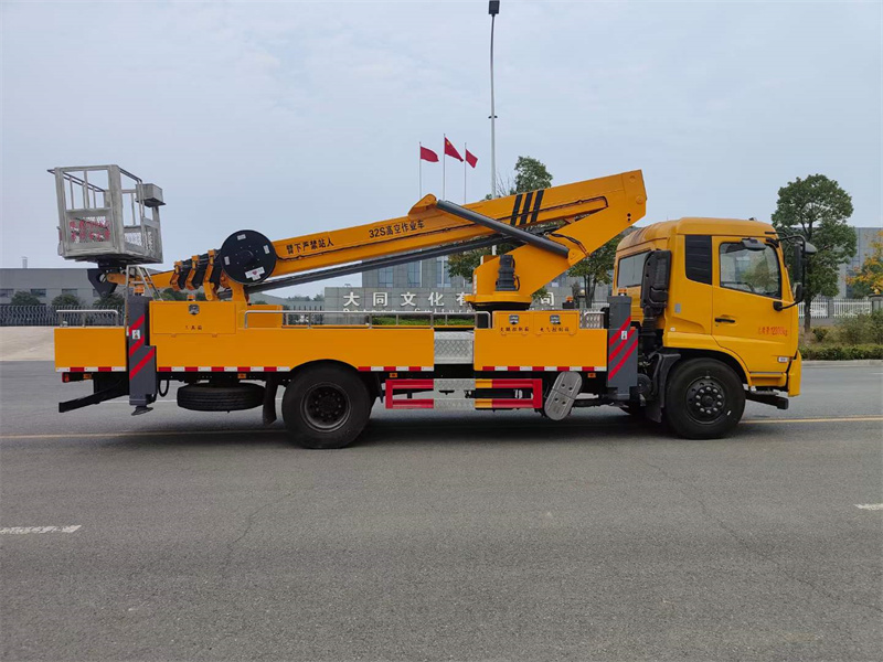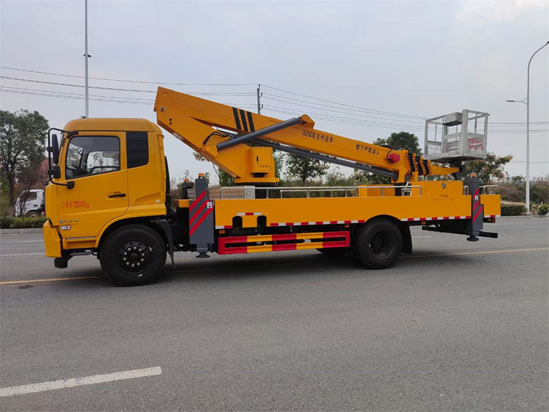 整車12.3噸黃牌車輛,五節八邊形大臂采用寶鋼Q90高強度鋼材,同步伸縮,最大作業高度32米,做大作業半徑19米,轉臺360度全回轉。