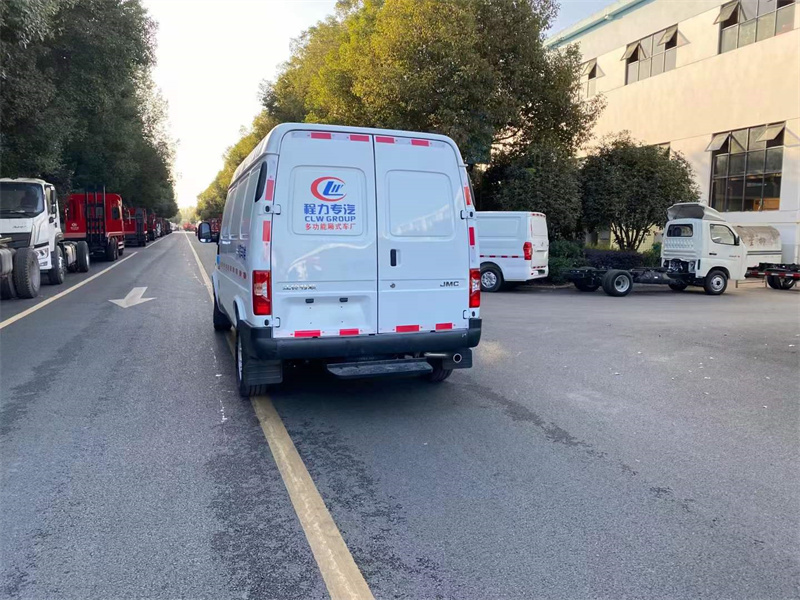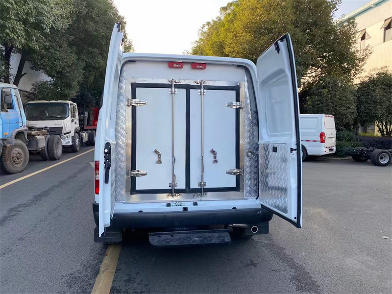 江鈴JX493ZLQ6發動機,115馬力柴油發動機,2.8L排量,國六排放,軸距3570mm,空調,方向助力,中控鎖,電動窗,遙控鑰匙,ABS,駕駛室準乘3人,總質量3510kg,整備質量2500kg,額定載質量815kg,輪胎規格225/65 R16C,廂體采用內外玻璃鋼材質制作,中間填充高密度保溫板,鋁花紋地板,不銹鋼門框鎖件,后雙開門,選裝進口或國產制冷機組。