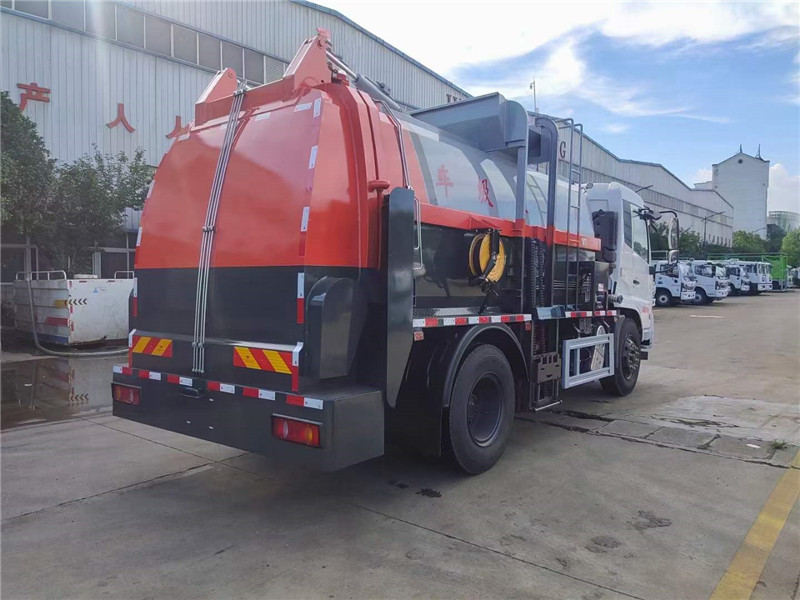 餐廚垃圾車配置:整車上裝采用Q345高強度錳鋼制作,容積約12立方,內置干濕分離,不銹鋼過濾網,推鏟卸料(不帶舉升),國內知名品牌液壓系統(嘉善取力器,中梅閥,合肥泵,國標油缸)液壓后蓋帶密封條,后門液壓鎖緊,進料口蓋液壓開關,后門鎖緊與后蓋開關具有防誤操作,側掛鏈條式提升機(國際標準120 L/240L方形塑料垃圾桶),提升機與推鏟具有防誤操作,CAN總線控制,箱體帶清洗裝置(清水箱,清洗機,水槍,卷盤)。